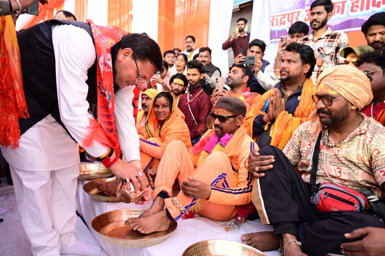 मुख्यमंत्री धामी ने कांवरियों की पैर पखारे एवं उनको अंगवस्त्र व पुष्प माला भेंट कर उनका अभिवादन किया, इसके उपरांत त्रिशूल चौक से सरस मेला कार्यक्रम स्थल गांधी पार्क तक आयोजित शिव बारात में प्रतिभाग किया