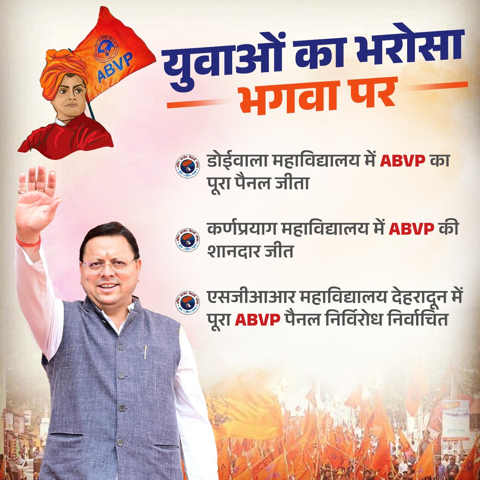 अखिल भारतीय विद्यार्थी परिषद (ABVP) को मिली बड़ी और ऐतिहासिक जीत ने स्पष्ट कर दिया कि प्रदेश के कॉलेज और विश्वविद्यालयों के छात्र, खासकर GenZ, भाजपा की विचारधारा और मुख्यमंत्री पुष्कर सिंह धामी के नेतृत्व वाली सरकार की नीतियों पर भरोसा रखते हैं। चुनाव परिणाम यह भी बताते हैं कि छात्रों के बीच सरकार के प्रति विश्वास की स्थिति विपक्ष के आरोपों से कहीं अलग है।