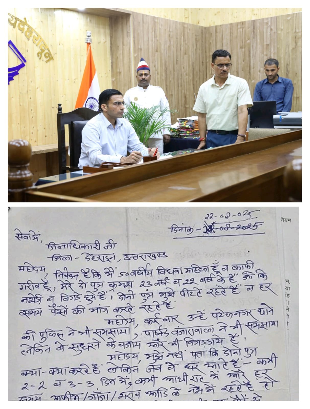 देहरादून दिनांक 25 अगस्त 2025; जिलाधिकारी कार्यालय कक्ष में विधवा महिला विजय लक्ष्मी पंवार पत्नी रव० मोहन सिंह पंवार, निवासी भागीरथपुरम, बंजारावाला ने जिलाधिकारी सविन बंसल से गुहार लगाई कि एक विधवा गरीब महिला है, उसके दोनो पुत्र, नशे के आदी व बिगड़े गडे हुये है और उन्हें मारते-पीटते है एवं हर समय पैसो की मांग करते है। कई बार उन्हें पुलिस एवं पार्षद ने भी समझाया, लेकिन वह सुधरने के बजाये और भी बिगड गये है। उनके पुत्र क्या करते हैं उन्हें नहीं पता है। लेकिन जब वह कभी 2 व 3 दिन में या कभी आधी रात में घर आते है और हर समय अफीम / गांजा / शराब व आदि के नशे में रहते है तो फिर अपनी माँ की पिटाई कभी डंडो से तो कभी हाथ-पैर से करते है व सिर्फ पैसा मांगते रहते है। अब तो न्होंने मुझे जान से मारने की धमकी दे दी है, जिससे में विधवा महिला अत्यधिक डरी हुई है। महिला को डर है कि उनके पुत्र उन्हें झोपडे में ही जान से मार सकते है।