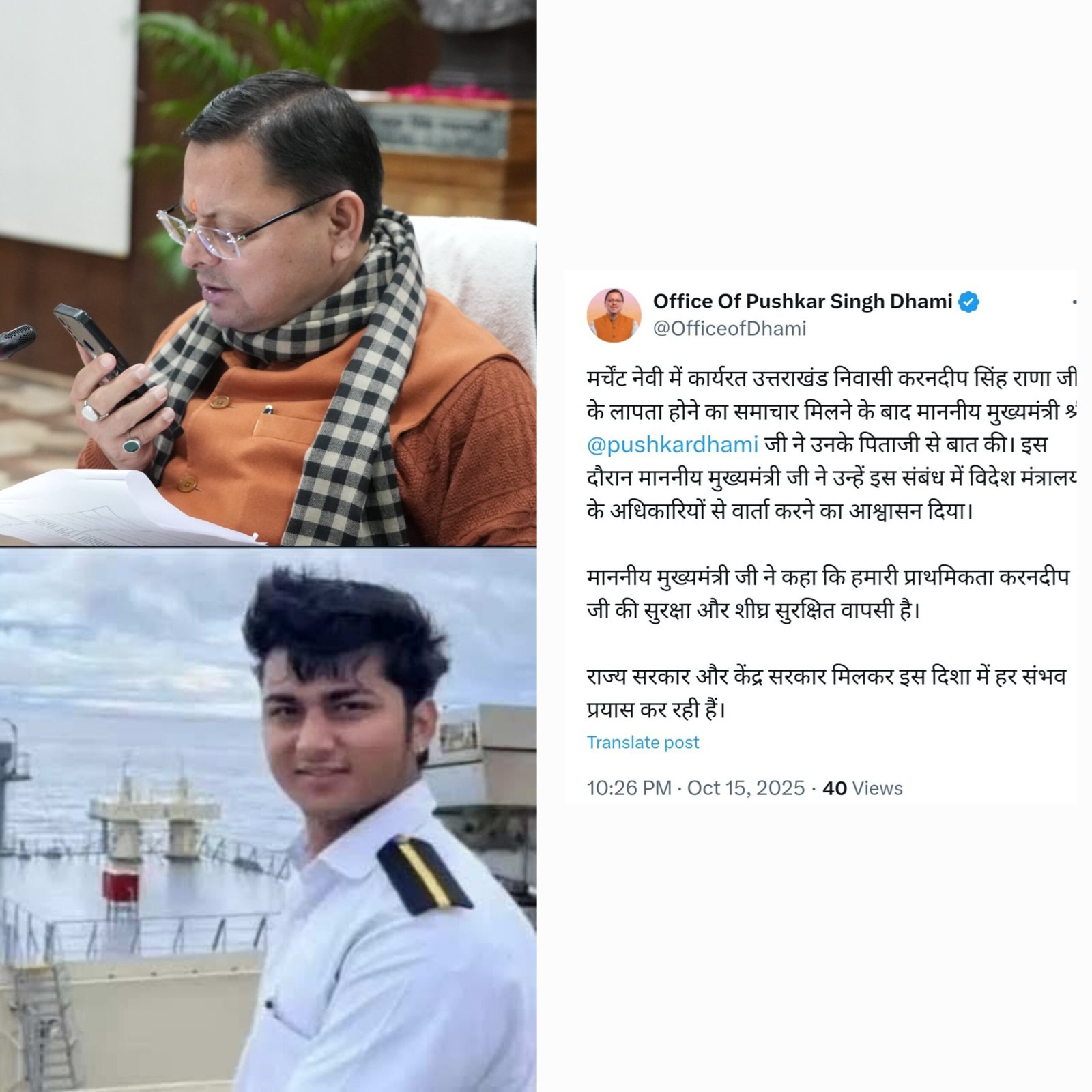 मुख्यमंत्री श्री पुष्कर सिंह धामी ने मर्चेंट नेवी में कार्यरत उत्तराखंड निवासी श्री करनदीप सिंह राणा के लापता होने के समाचार पर गहरी चिंता व्यक्त की है। इस संबंध में मुख्यमंत्री श्री धामी ने आज श्री करनदीप सिंह राणा के पिताजी से दूरभाष पर बातचीत कर उन्हें हरसंभव सहायता और सहयोग का भरोसा दिलाया।